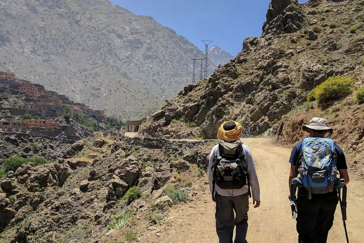 L’itinéraire standard passe par Imlil → Sidi Chamharouch → Refuge (depuis l’est). Ce trek approche par l’ouest via la vallée d’Azzaden, les cascades d’Ighouliden et le col d’Aguelzim (3 550 m). Plus panoramique, avec une meilleure acclimatation, mais le col d’Aguelzim constitue lui-même une montée exigeante.