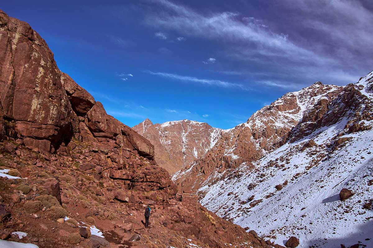 Transfert de Marrakech à travers les gorges de Moulay Brahim jusqu’à Imi Oughlad (1 450 m). Randonnée d’acclimatation à travers les champs de maïs, les pins et les genévriers jusqu’au Tizi n’Tachte (2 000 m), avec vues sur les vallées d’Imlil et d’Ait Oussaden. Déjeuner à Imi n’Ifri. Descente vers le village en terrasses d’argile rouge de Tiziane (1 750 m). Nuit en gîte.